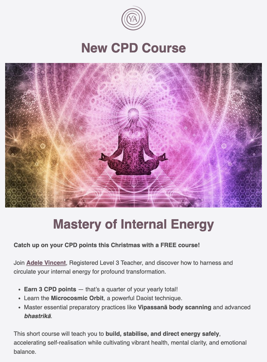 Yoga Australia is hosting my new short course, Mastery of Internal Energy. Click on the image below to go to the course webpage, and read the brief below. Note that you must be a Yoga Australia member to access the course.